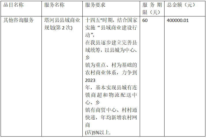 网站首页 > 项目展示 > 咨询服务 咨询服务 政府及纪检办公楼保洁服务 项目概况塔河县对外合作服务中心,于2023年04月14日就塔财购核字[2023]00280号塔河县县域商业规划(第2次)(项目编号HLJGCYC2003990020231259369)进行询价采购。