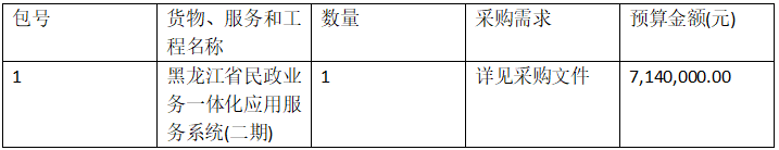 网站首页 > 项目展示 > 政府采购 政府采购 黑龙江省民政业务一体化应用服务系统(二期) 项目名称:黑龙江省民政业务一体化应用服务系统(二期)批准文件编号:黑财购核字[2022]06563号采购项目编号:[230001]GZXMGL[GK]202200032.内容及分包情况(技术规格、参数及要求)
